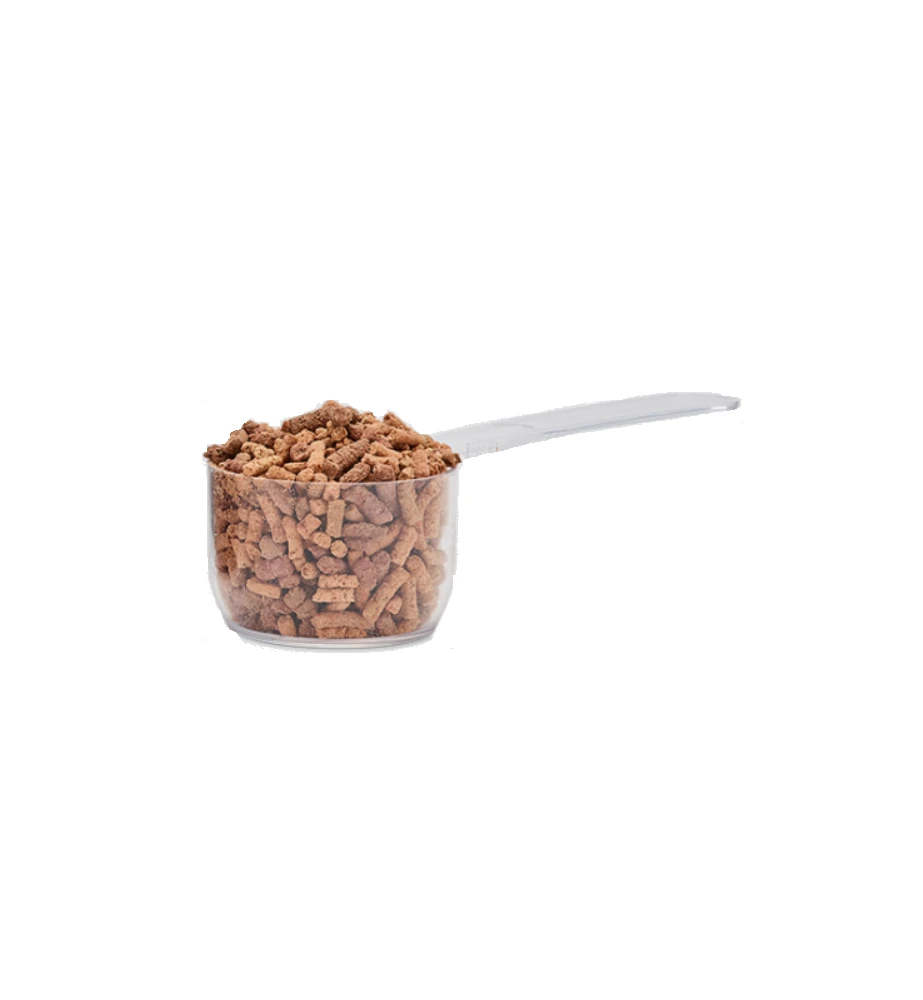 • Ruwvoer + granen: 2 maatschepjes per dag.