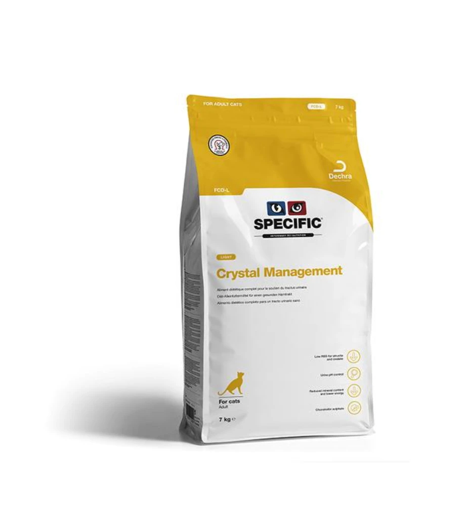 Specific Crystal Management Light FCD-L is een dieetvoeding voor katten de preventief werkt tegen de vorming van struviet- en calciumoxalaat gruis. Vanwege de lage energiewaarde is deze voeding ideaal voor katten die problemen hebben met overgewicht. Door het lage gehalte aan natrium is deze voeding geschikt om langdurig te geven. In het Specific Crystal Management Light FCD-L dieet zitten minder mineralen (magnesium & fosfor) wat ervoor zorgt dat zich geen nieuwe kristallen vormen. Daarnaast is de voeding rijk aan Omega-3 vetzuren uit vis (EPA & DHA) wat zorgt voor een gezonde vacht, huid en soepele gewrichten.